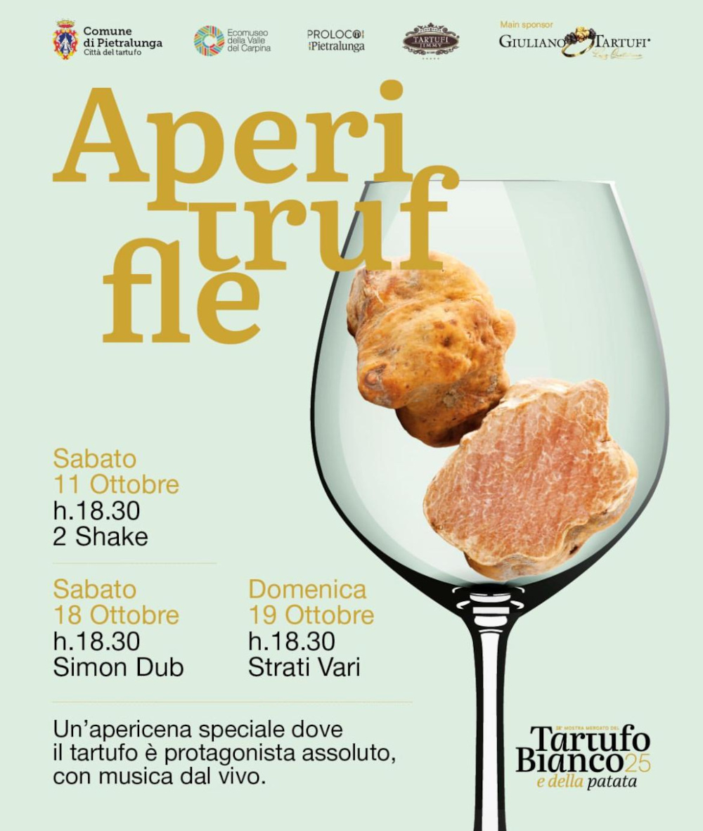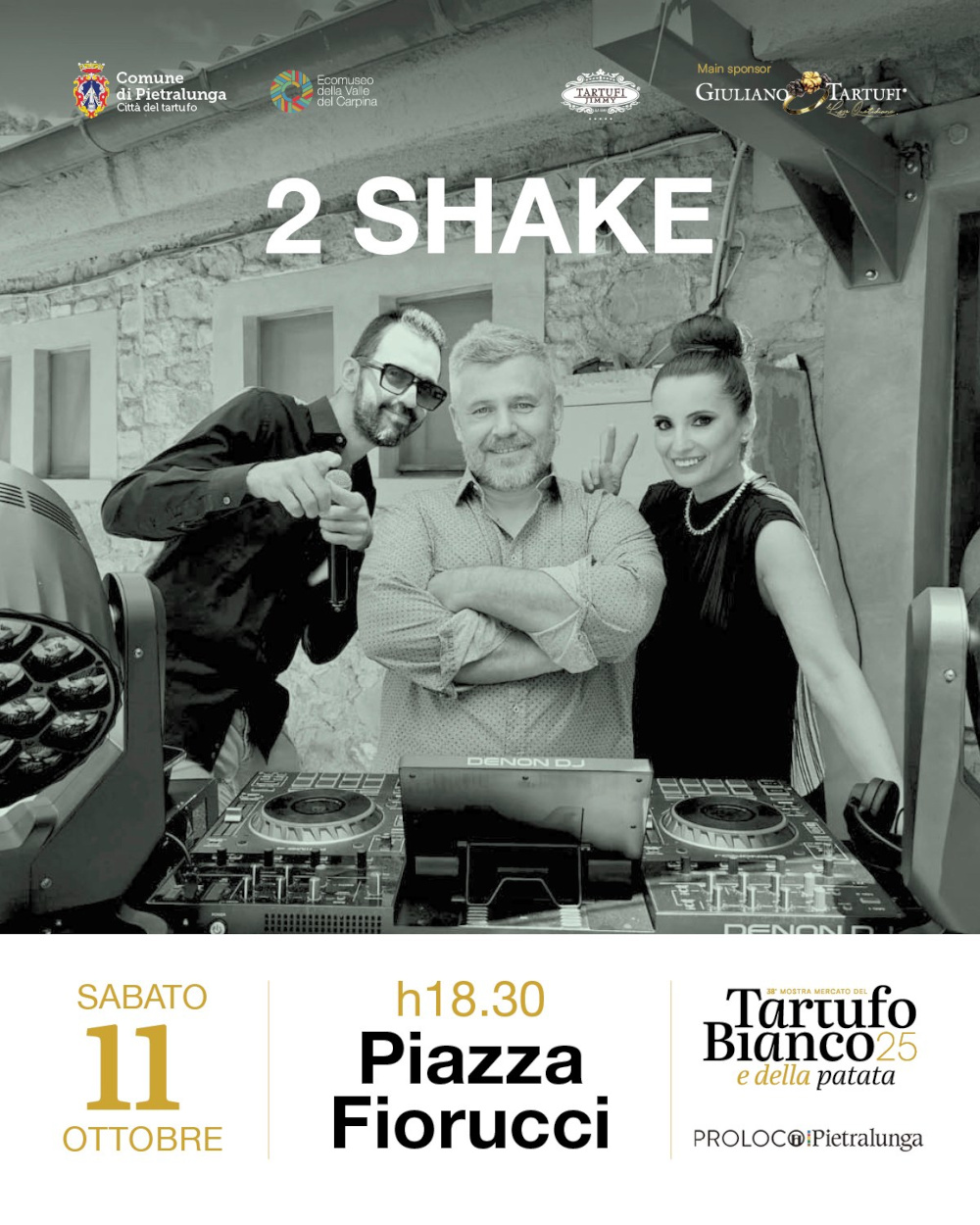 Ore 18:30 | Piazza Fiorucci AperiTruffle - Un’apericena speciale dove il tartufo è protagonista assoluto, abbinato a calici selezionati e a piatti creativi che esaltano i sapori autentici del territorio. Un momento di gusto e convivialità in un’atmosfera unica con la musica dal vivo dei 2 Shake Cena presso i nostri ristoranti a base di tartufo e patata |