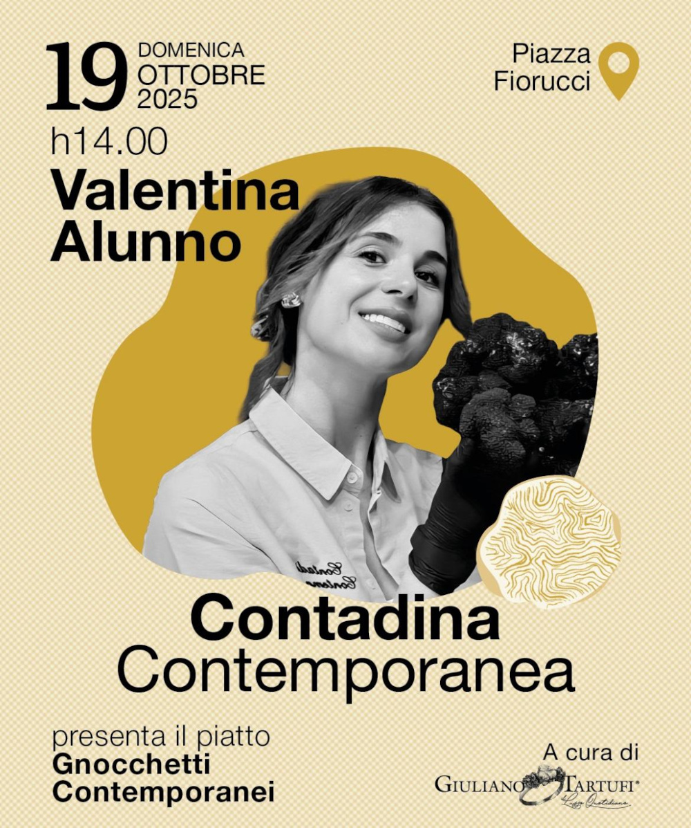 Dalle ore 14:00 | Piazza Fiorucci Valentina Alunno “Contadina Contemporanea” presenta il piatto “Gnocchetti Contemporanei” a cura main sponsor Giuliano Tartufi |