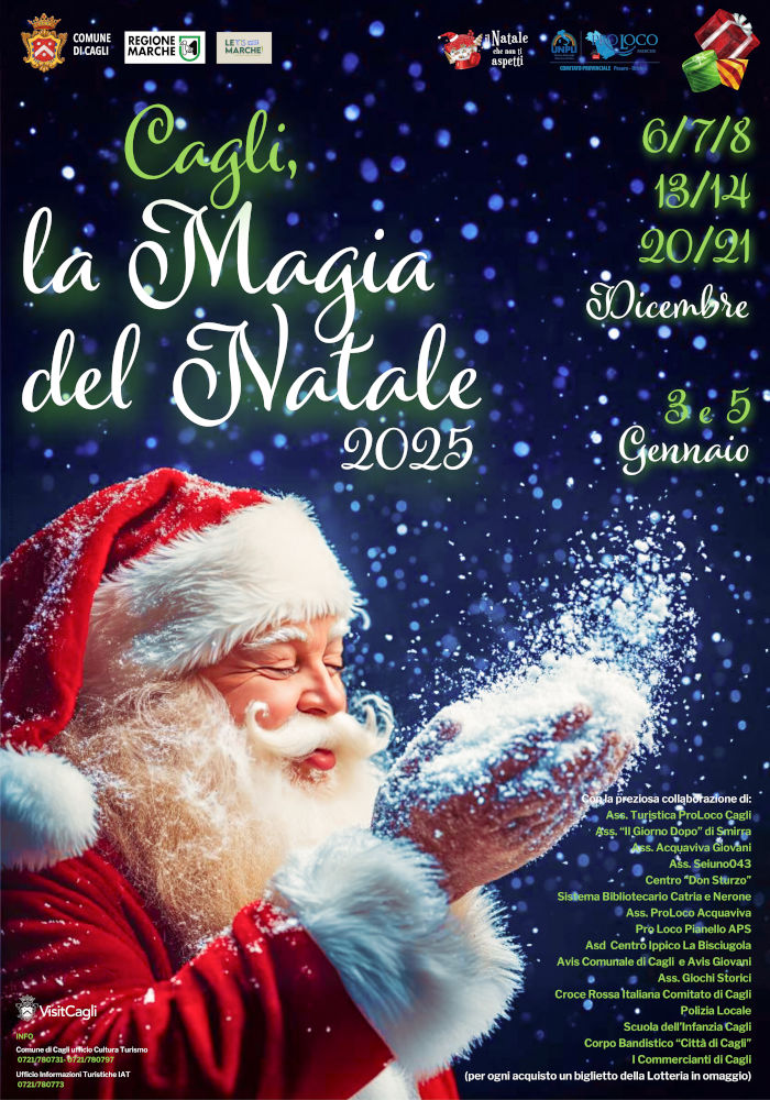 | - Rassegna dei Presepi, a cura del Centro Culturale Don Sturzo, dal 6 dicembre al 6 gennaio 2026 - Lotteria di Natale, a cura dei Commercianti e della Pro Loco di Cagli - per ogni acquisto un biglietto in omaggio - Laboratorio per bambini “dai Saturnali al Natale: il gioco dei Dadi” presso il Museo archeologico e della via Flaminia il 26 dicembre dalle ore 16.00 - Concerto di fine anno della Banda Cittadina il 28 dicembre - ore 21.00 |