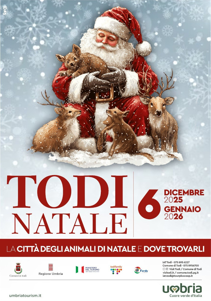 DOMENICA 7 DICEMBRE ore 10 > ex Monte dei Paschi di Siena MATTONCINI A TODI a cura dell'Ass. La Forza delle Idee ore 15,30 > via Mazzini, 24 LA CASA DEGLI ELFI Mascotte, Truccabimbi, Animazione e Zucchero Filato a cura dei Commercianti del Centro Storico ore 16 > Voltoni Comunali (ex libreria Foglietti) Apertura de LA CASA DI BABBO NATALE ore 16,30 > Piazza del Popolo Spettacolo Musicale CHRISTMAS BUSKERS - FIRESTRINGS ore 16,30 > Sala Affrescata del Museo-Pinacoteca Christmas Lab L’ARTE PRENDE FORMA Dai 4 anni - evento gratuito prenotazioni: peppertodi@gmail.com / 346 5147236 a cura della Fondazione Beverly Pepper ........................................................................... LUNEDÌ 8 DICEMBRE ore 10 > ex Monte dei Paschi di Siena MATTONCINI A TODI a cura dell'Ass. La Forza delle Idee ore 16,30 > Ridotto del Teatro Comunale Spettacolo per bambini e famiglie AL MARE! A NATALE! a cura di Micro Teatro Terra Marique ore 17,30 > Teatro Comunale Nuova Apertura CAFFÈ DEL TEATRO Degustazione di Cioccolata e Panettoni Artigianali a cura di Tour + ore 18 > Piazza del Popolo Spettacolo Musicale CHRISTMAS BUSKERS - MUSICA MUTA ore 18 > Via Mazzini , 24 DEGUSTAZIONE DI VINI LOCALI a cura dell’Ass. Todi Terra di Vini e Confesercenti ........................................................................... MARTEDÌ 9 DICEMBRE ore 9,30 > Centro Storico IL VIAGGIO DELLA FIAMMA OLIMPICA Partenza da Porta Romana Arrivo Tempio di San Fortunato ore 16,30 > Biblioteca Comunale L. Leonj CAPIRE IL FUMETTO Corso per Bambini a cura di Claudia Favilli e Manuel Bracchi ........................................................................... GIOVEDÌ 11 DICEMBRE ore 10 > ex Monte dei Paschi di Siena Apertura MERCATINO DI NATALE PER GLI ANIMALI a cura di Ass. A.T.T.A di Todi Aperto tutti i giorni: 10/13 - 16/19 fino al 25 dicembre 2025 ore 17 > Mensa Auditorium della Scuola CONCERTO DI NATALE Orchestra Junior della Scuola Cocchi Aosta in collaborazione Rotary Club di Todi ........................................................................... SABATO 13 DICEMBRE ore 11 > Sala del Consiglio Comunale CONFERIMENTO CITTADINANZA BENEMERITA AL PROF. ERNESTO GALLI DELLA LOGGIA ore 15 > Sala del Consiglio Comunale PREMIO ECCELLENZE SPORTIVE CITTÀ DI TODI ore 15,30 > per le Vie del Centro Storico QUINTETTO ITINERANTE - OGIREUM a cura dei Commercianti del Centro Storico ore 16,30 > La Casa degli Elfi - Via Mazzini, 24 CREA LA TUA CANDELA DI NATALE Laboratorio di Candele di Charline Oosterlinck a cura dei Commercianti del Centro Storico ore 16 > Voltoni Comunali (ex libreria Foglietti) Apertura de LA CASA DI BABBO NATALE Quartiere di Porta Romana SOTTO LE LUCI DI NATALE a Porta Romana Art District ore 18 > S. MESSA DI SANTA LUCIA ore 19 > CANTI NELLA CHIESA del CORO DI COLLEVALENZA a cura del Comitato Porta Romana Bella ore 21,15 > Teatro Comunale di Todi Spettacolo di Danza LO SCHIACCIANOCI Balletto di repertorio di danza classica in due atti Allievi della Scuola Tuder Ballet Studio Direttrice Maida Mazzuoli info: Scuola Tuder Ballet Studio ........................................................................... DOMENICA 14 DICEMBRE dalle ore 8 MERCATINI PER LA VIA a cura di Porta Romana Art District dalle ore 9 alle ore 19 Parcheggio del Centro Commerciale Quadrifoglio ANTICAMENTE Apertura Mostra-Mercato di Antiquariato, Modernariato e Piccolo Collezionismo a cura dell’Associazione Culturale InDivenire ETS di Todi ore 14,30 > Piazza del Popolo KIDS URBAN TREK Bambini in Cammino [4/11 anni] A CACCIA DELLE AQUILE E DEGLI ANIMALI FANTASTICI DELLA CITTÀ a cura dell’Associazione Natural Slow Life > gratuito dalle ore 16 CACCIA E GIOCHI CON GLI SCOUT FAVOLE ITINERANTI a cura della Compagnia Le Mani in Tasca ore 16 > Voltoni Comunali (ex libreria Foglietti) Apertura de LA CASA DI BABBO NATALE ore 16,30 > Piazza Garibaldi Spettacolo Musicale TRIO MUSICALE - PLAYSING a cura dei Commercianti del Centro Storico ore 16,30 > Piazzetta della Rua DISEGNI E COLORI NATALIZI - SUPER EROI Palloncini, Pop Corn e Tatuaggi con Super Matty a cura dei Commercianti del Centro Storico ore 17 > Ridotto del Teatro Comunale NOTE VERE Concerto di Musica Barocca con strumenti d’epoca - Collegium Pro a cura di Filarmonica Umbra ETS dalle 18 MUSICA a cura di Porta Romana Art District ore 21 Tempio di Santa Maria della Consolazione CONCERTO DI NATALE Solisti e Coro dell'Università degli Studi di Perugia Direttore Salvatore Silvestro a cura di A.gi.mus. Perugia ........................................................................... MARTEDÌ 16 DICEMBRE ore 16,30 > Biblioteca Comunale L. Leonj CAPIRE IL FUMETTO Corso per Bambini a cura di Claudia Favilli e Manuel Bracchi ........................................................................... GIOVEDÌ 18 DICEMBRE ore 16,30 > Biblioteca L. Leonj REALIZZIAMO UN ALBERO DI NATALE MULTICOLORE Laboratorio Fare Insieme a cura di Vanessa Regno ........................................................................... VENERDÌ 19 DICEMBRE ore 16> Quartiere di Porta Romana SOTTO LE LUCI DI NATALE a Porta Romana Art District CONSEGNA DEI LAVORETTI REALIZZATI CON GLI ARTISTI ai bimbi di S. Fortunato e foto artisti bimbi e genitori a seguire Animazione per bambini a cura del Comitato Porta Romana Bella ........................................................................... SABATO 20 DICEMBRE ore 16 > Voltoni Comunali (ex libreria Foglietti) Apertura de LA CASA DI BABBO NATALE ore 15,30 > Piazza del Popolo ANIMAZIONE IN PIAZZA Babydance, Zucchero Filato e Mascotte di Natale a seguire SPETTACOLO DI MAGIA Super Matty a cura dei Commercianti del Centro Storico ore 17 - Sala Affrescata del Museo Pinacoteca Presentazione del libro ANNUS HORRIBILIS di Saverio Raimondo, Comico e autore Modera Valentina Parasecolo ore 17 - Auditorium Scuola Cocchi - Aosta Spettacolo Musicale SAGGIO DI NATALE a cura della Scuola Comunale di Musica ....................................................