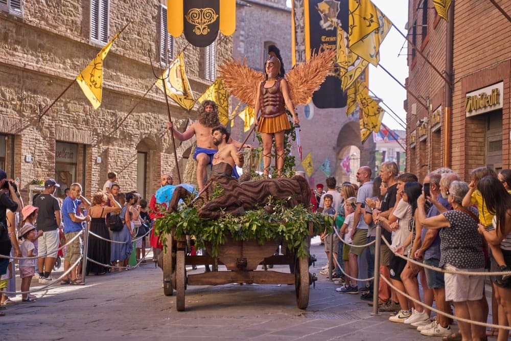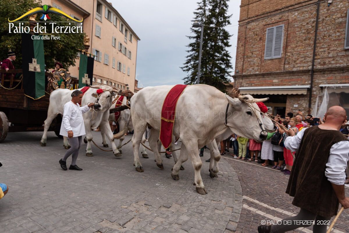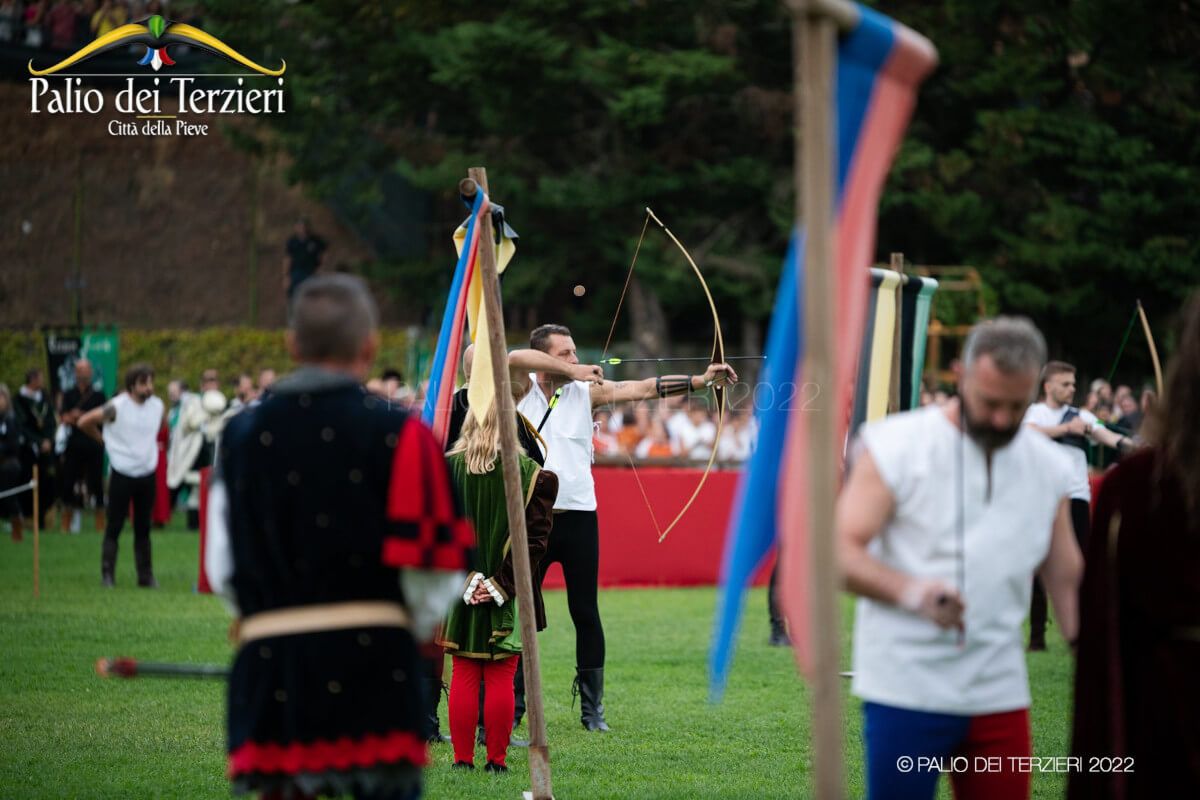 La Caccia del Toro del Palio dei Terzieri rievoca, in forma incruenta, le antiche cacce senesi, una sorta di corride che ancora ai tempi del Perugino si svolgevano nella città ghibellina, alla quale guarda Città della Pieve, per secoli ribelle allo stato della Chiesa. Il giorno del palio, dopo il corteo storico che parte da Piazza Plebiscito e accompagna gli arcieri al Campo de li Giochi, si svolge la gara di tiro con l’arco. I campioni, tre per Terziere, hanno a disposizione tre frecce per ciascun tiratore. Il Palio storico, che viene conteso ogni anno dai terzieri, è uno splendido arazzo dipinto, opera del maestro pievese Antonio Marroni, raffigurante gli arcieri nell’atto di rendere omaggio al maestro di campo.