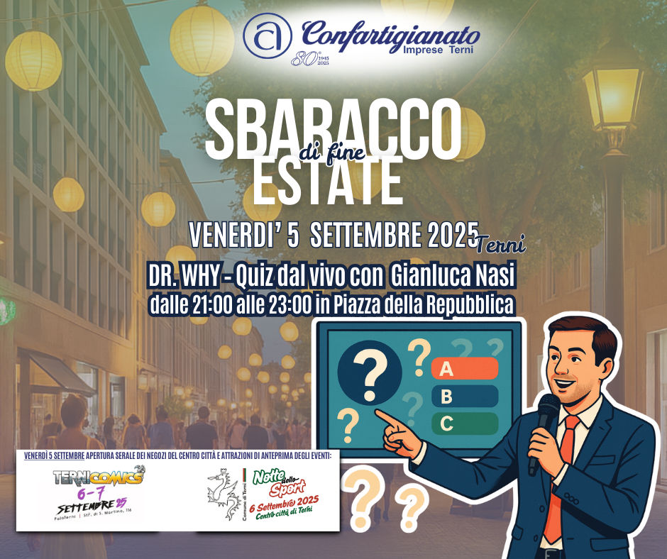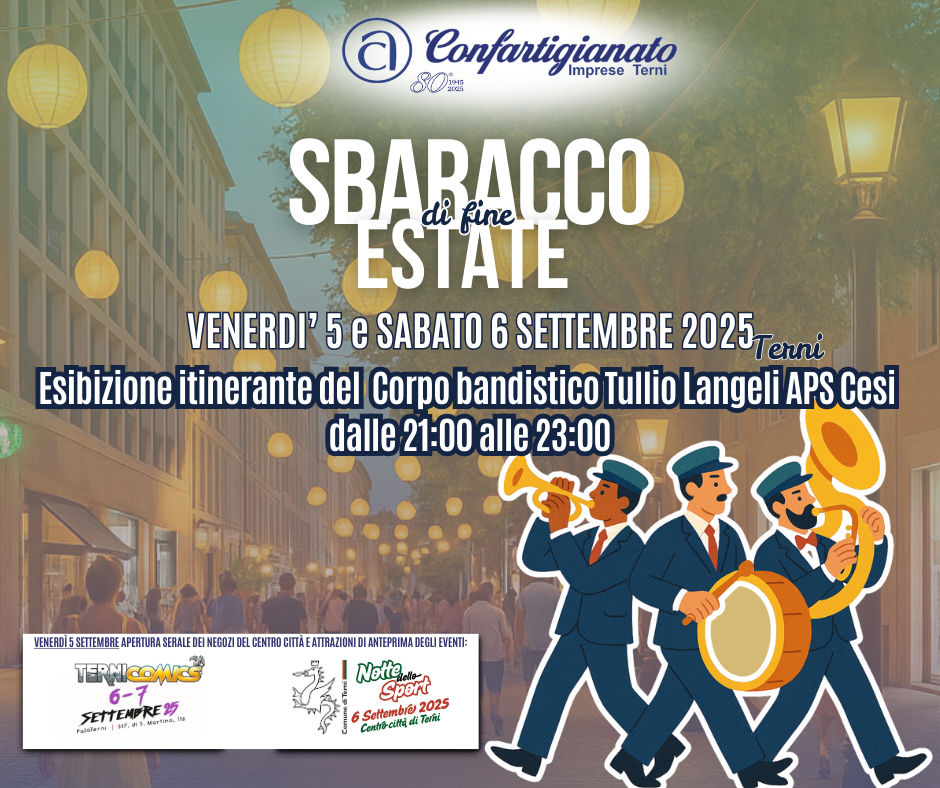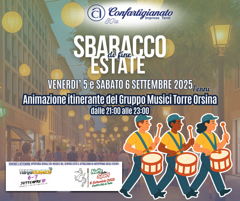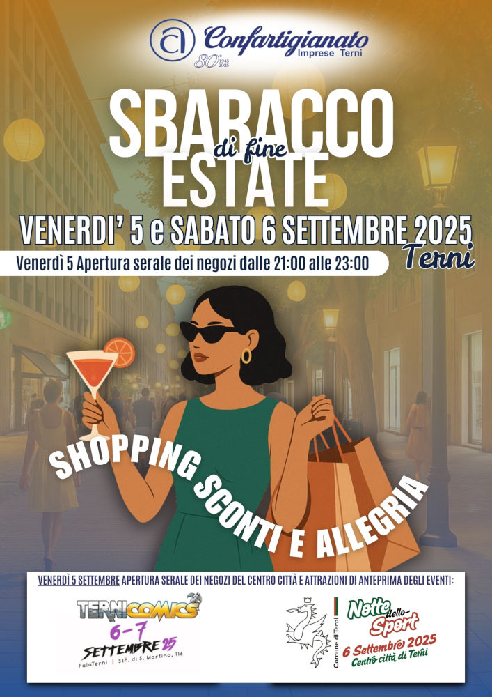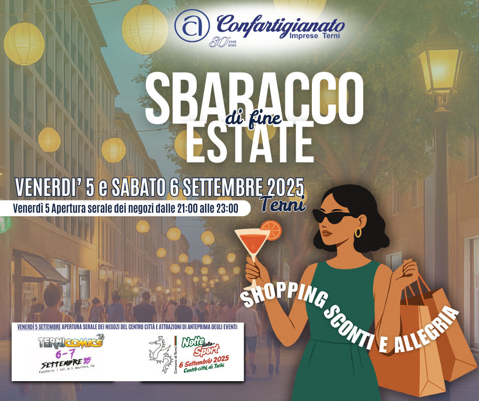 8b9a56acContenuto di f191e625 UmbriaEventi.com bbcf681aLo Sbaracco di Fine Estate, organizzato da Confartigianato Imprese Terni in collaborazione con Comune di Terni, Terni Comics e Comitati di Via, consiste in una due giorni di vendita straordinaria ad opera dei negozi del centro città dedicati a shopping, grandi sconti e tanta allegria