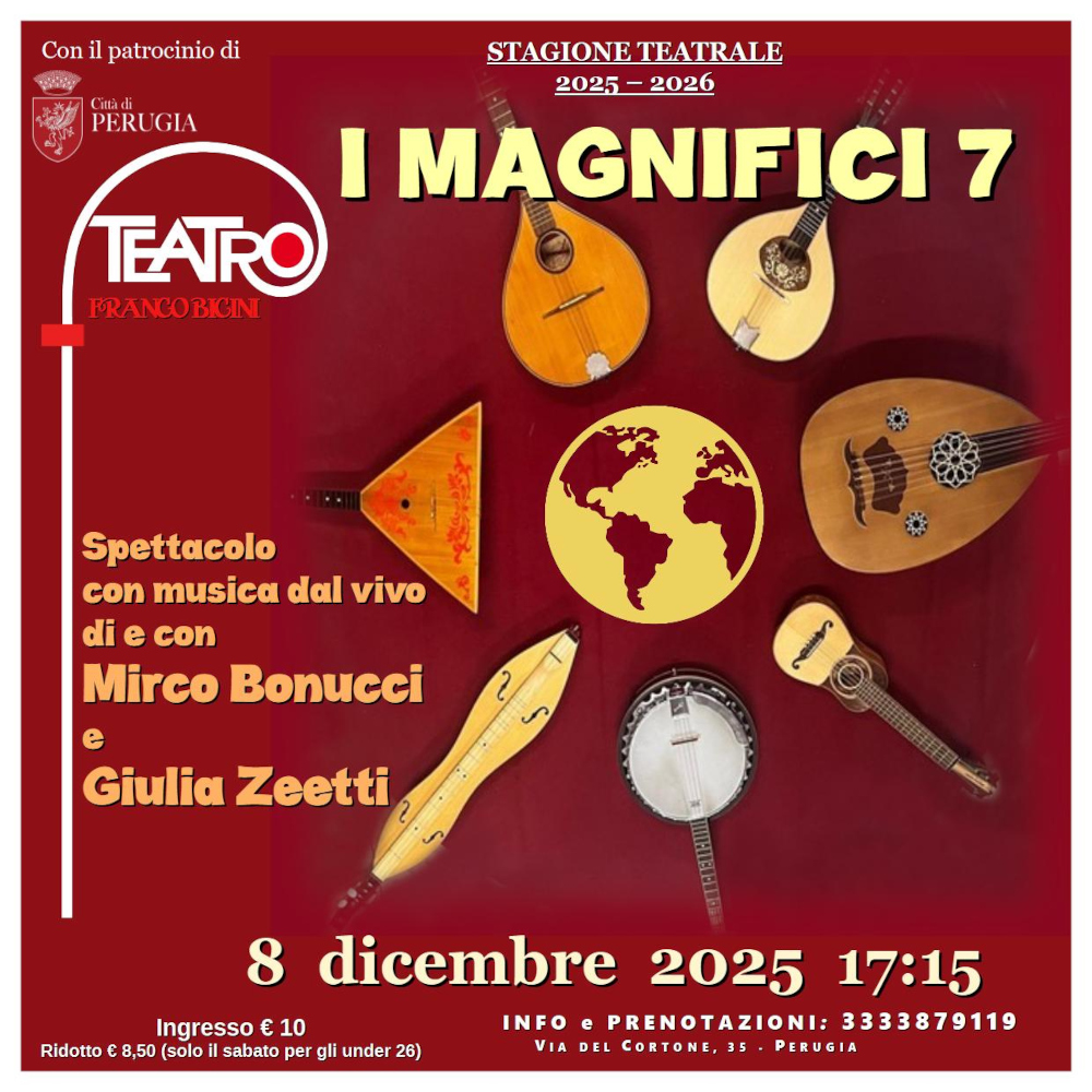 I magnifici sette, i rappresentanti del mondo degli strumenti a corda e del mondo magico della musica, si fanno conoscere in questo spettacolo di narrazione dove ad ogni favola proveniente da una parte del mondo è abbinato un brano musicale che ne crea l’ambientazione.